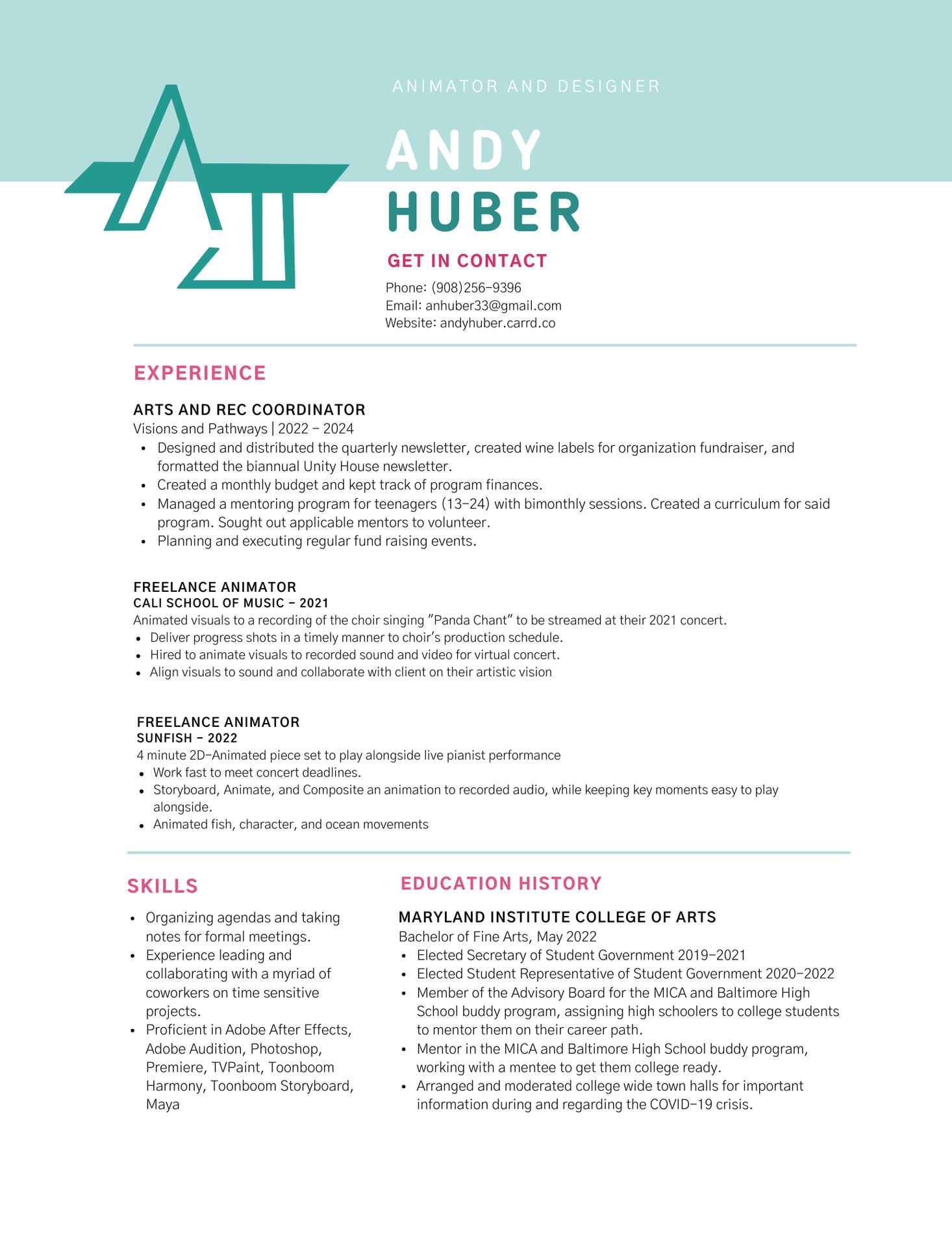 Andy Huber graduated from Maryland Institute College of Arts with a BFA in Animation and a concentration in Sound Design